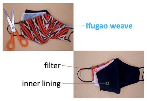 Made with an outer layer of Ifugao weave, a non-woven polypropylene layer for filtration, and polyester inner lining for comfort. Handwoven in Ifugao.